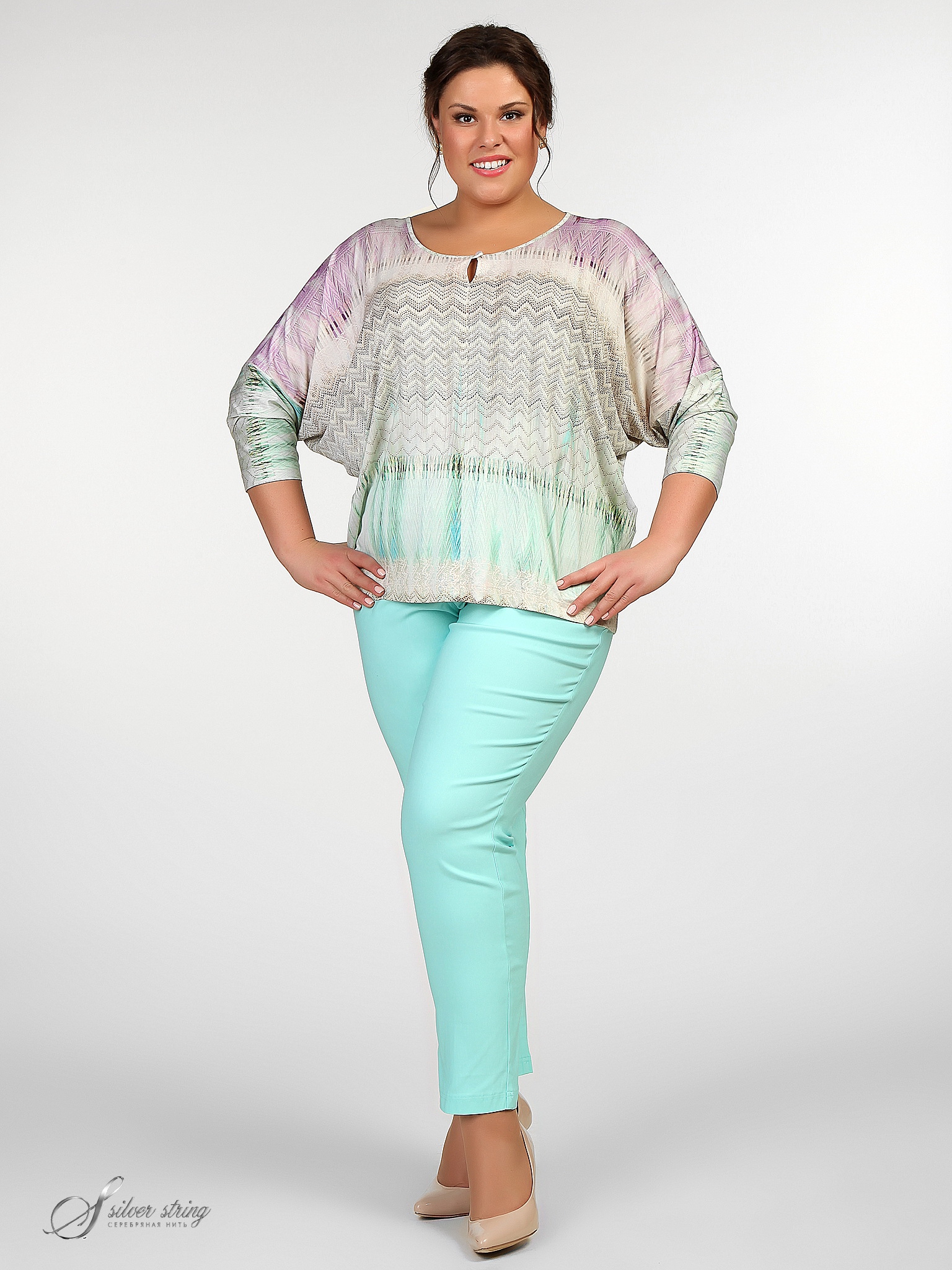 Блуза с цельнокройным рукавом из вискозного трикотажного полотна с оригинальным принтом, выполненным в технике digital. По горловине модель застегивается на 1 пуговицу на полочке.