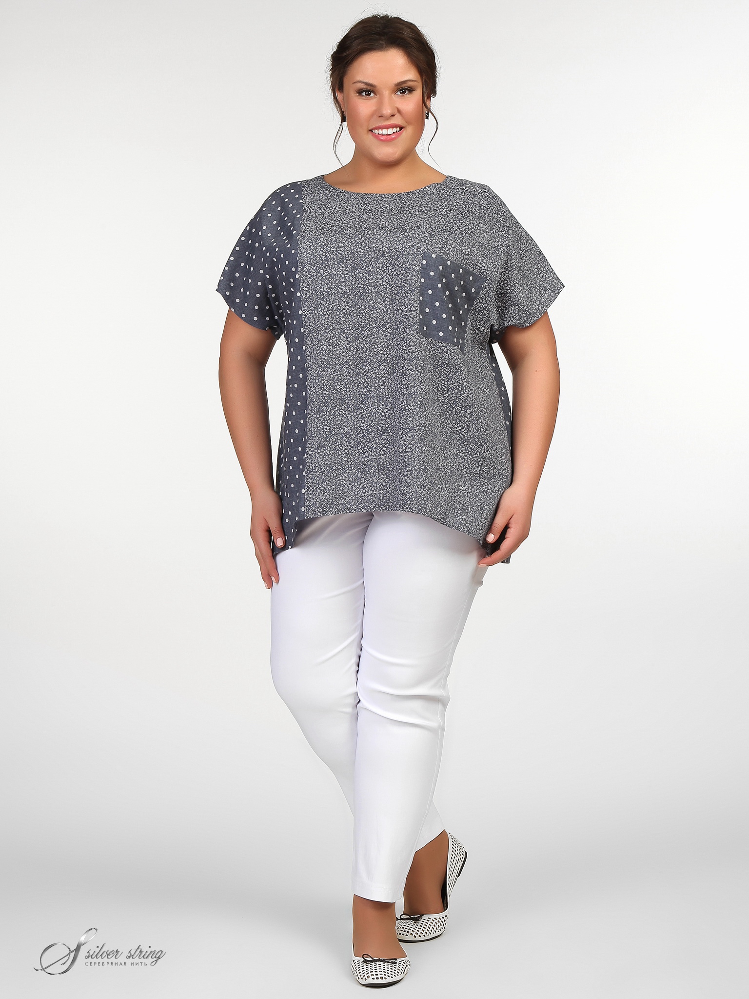 Блузка прямого силуэта. Горловина круглой формы. Рукав спущенный, короткий. Один накладной карман по полочке. Ткань тонкий хлопок. В модели используется несколько дизайнов ткани.