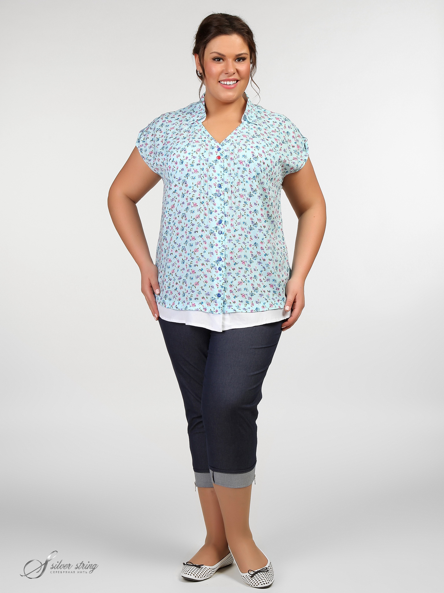 Блузка летняя, ткань штапель. Воротник спортивный. Застежка пуговицы петли. Защипы по полочке. Рукав короткий, присобран на пату. В модели используется однотонная отделочная ткань.