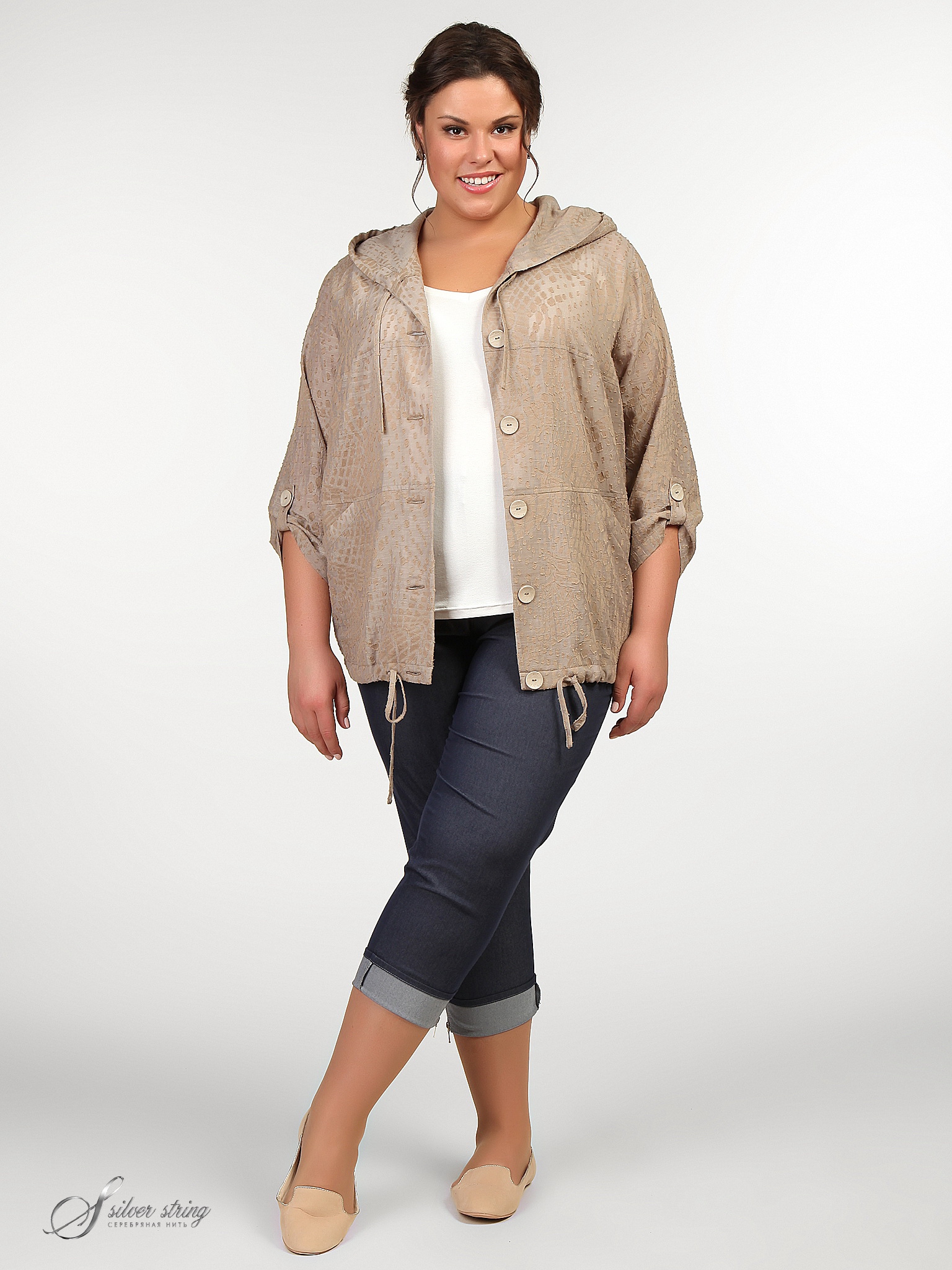 Легкая ветровка прямого силуэта с капюшоном и застежкой на молнию. На полочке обработаны удобные карманы-"кенгуру". Длину рукава можно регулировать по длине с помощью паты. По низу модели проложена кулиса, позволяющая регулировать объем.