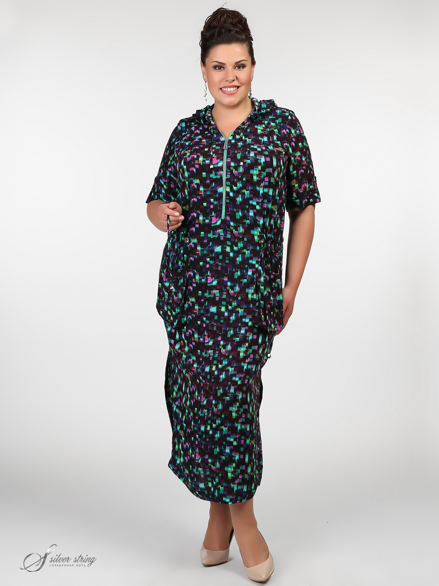 Легкое удлиненное платье прямого силуэта с капюшоном и рукавом, длиной до локтя. Объем изделия регулируется кулисой, расположенной чуть ниже линии талии. По переду обработаны накладные карманы-портфели. Платье с застежкой-молнией и высокими разрезами в боковых швах .