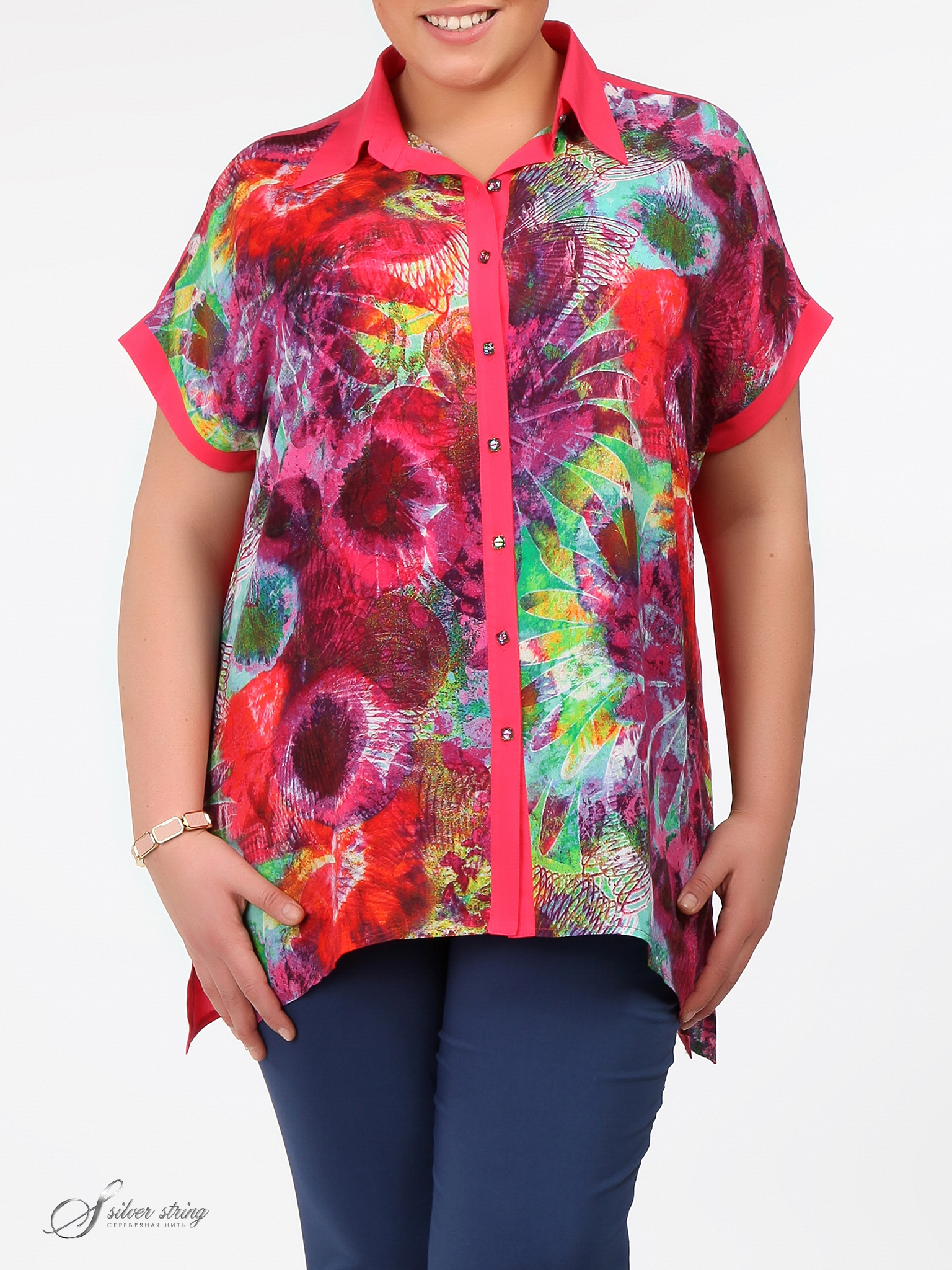 Блуза свободного силуэта, с рубашечным воротником и фигурно оформленным низом. Модель выполнена из тканей-компаньонов.
