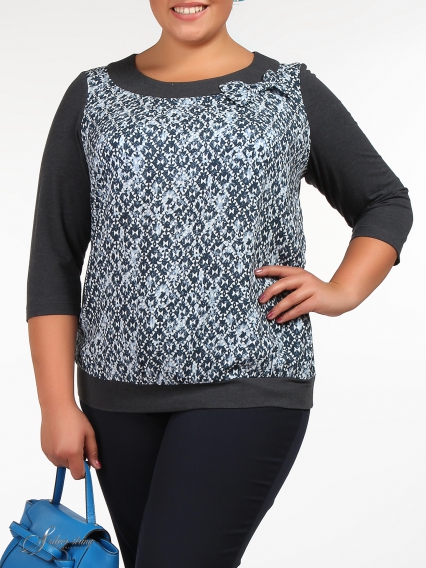 Блузка прямого силуэта. Основная ткань трикотаж, полочка и бант по горловине текстиль. Горловина круглой формы. Рукав втачной, длина 3/4. Низ изделия обработан трикотажным поясом. По спинке обработан декоративный вырез в виде капельки.