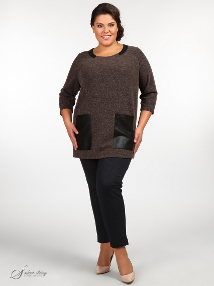 Мягкий джемпер прямого силуэта, с разрезами в боковых швах. Рукав длинный. По линии горловины проходит отделка из эко-кожи, из неё же выполнены большие накладные карманы на полочке.