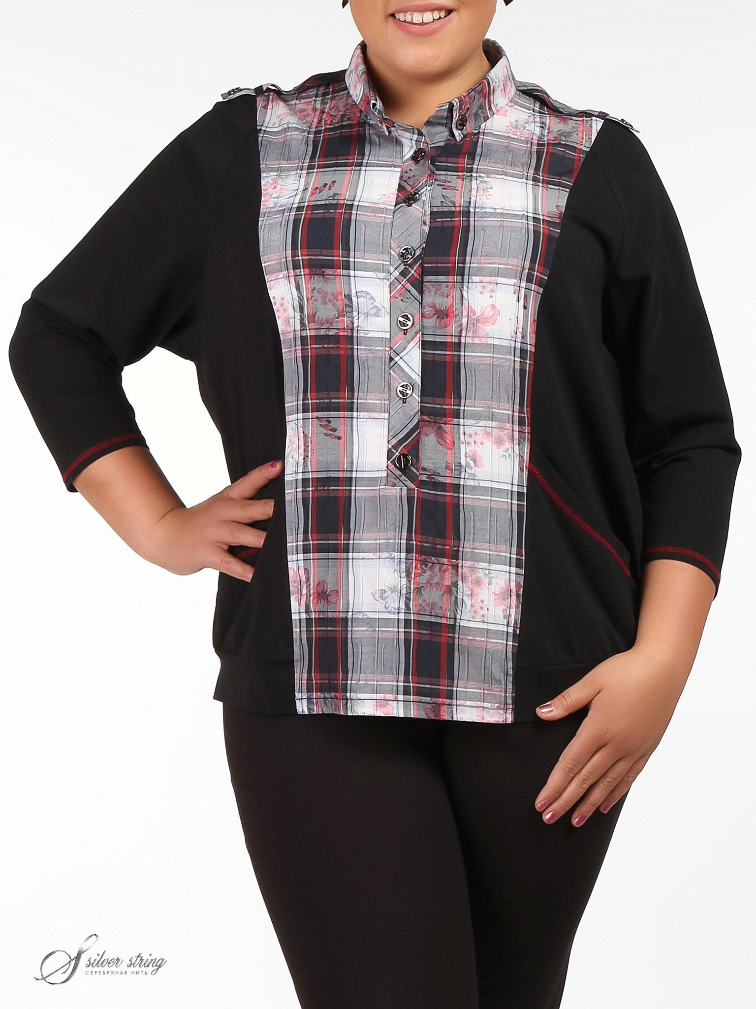 Блузка "Т" образного силуэта. Рукав реглан, длина 3/4. Воротник рубашечный. Застежка на петли и пуговицы. По плечам паты на пуговицы. Карманы свободные, настрочные. Модель трикотажная, деталь полочки текстиль.