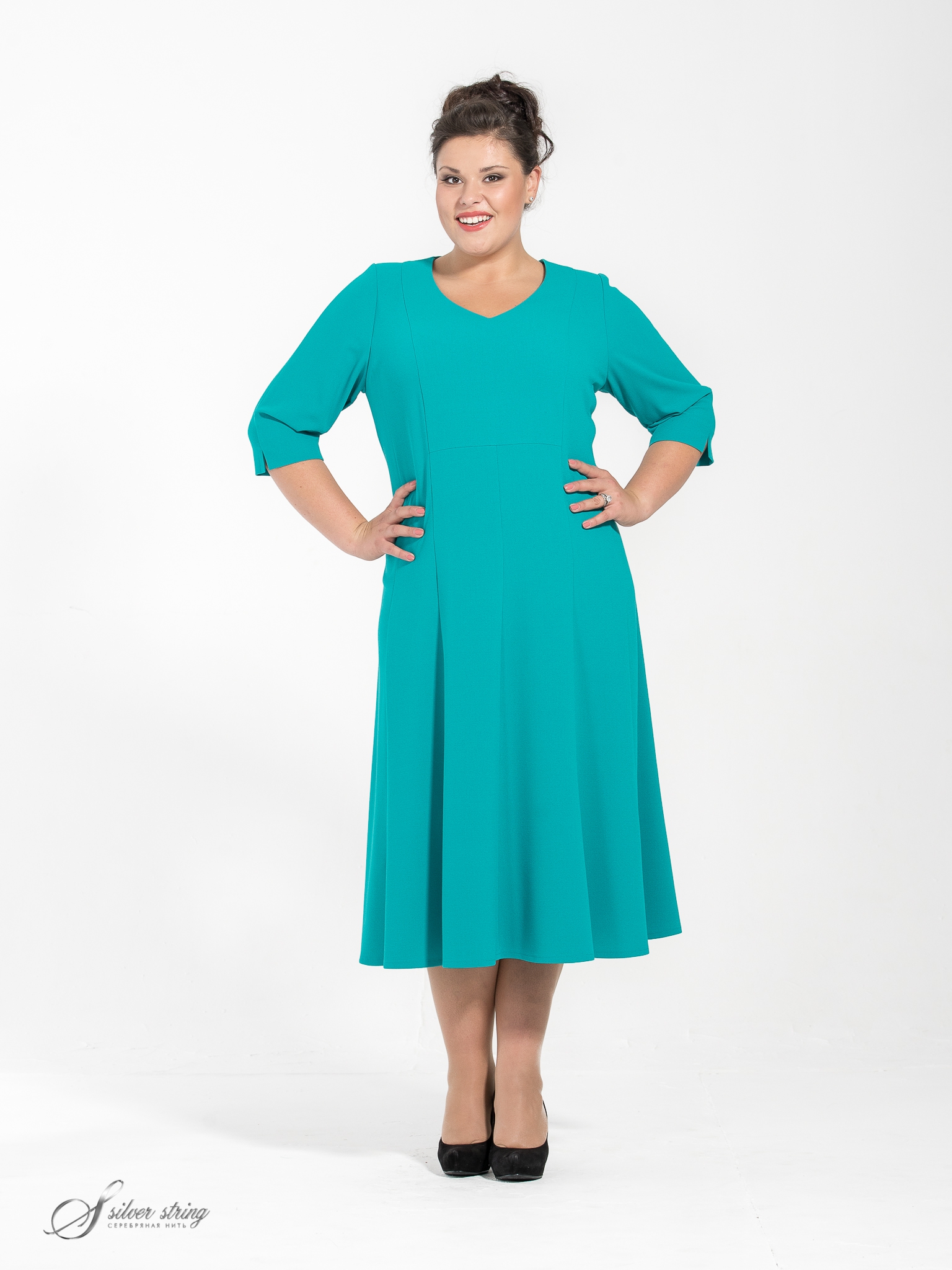 Удлиненное платье из эластичного крепа, с у-образной горловиной и рукавом, длиной 3/4. Модель с лифом небольшого объема и клешем к низу. В боковом шве обработана потайная молния.