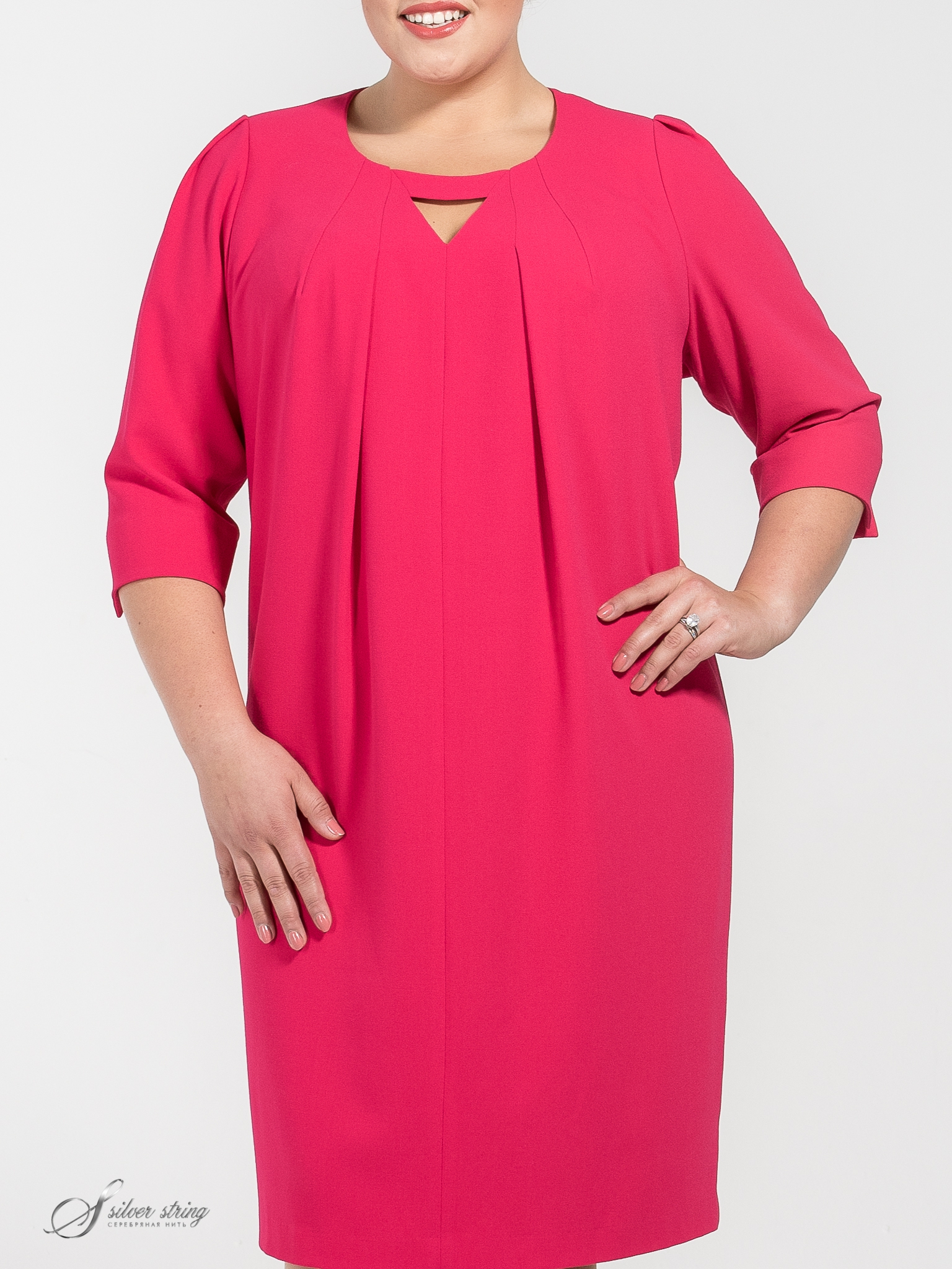 Элегантное платье полуприлегающего силуэта с рукавом, длиной 3/4. Мягкие складки, идущие от линии горловины, хорошо маскируют возможные недочеты фигуры. По окату рукава заложены небольшие складки, в локтевых швах обработаны пикантные разрезы. По горловине спинке застежка на потайной крючок.