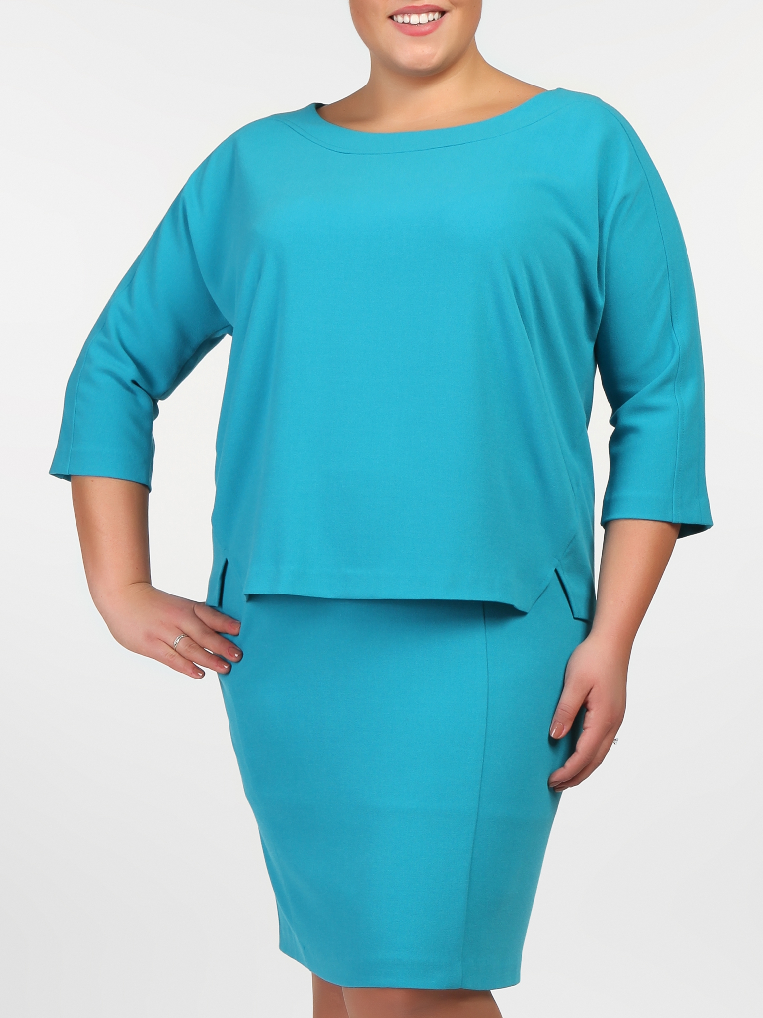 Юбочный костюм из крепа.Укороченный блузон с цельнокроеным рукавом, длиной 3/4 и расширенной горловиной-лодочкой.Боковые швы блузона переходят на полочку и заканчиваются разрезами в виде буквы "Л". Зауженная к низу юбка-карандаш, длиной за линию колен.