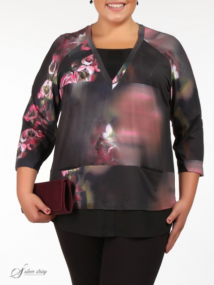 Трикотажный джемпер прямого силуэта. Стиль свободный. Рукав реглан, длина 3/4. Горловина "У" образная, в которой обработана вставка из текстиля. По низу изделия проходит горизонтальный подрез, в котором обработаны карманы.
