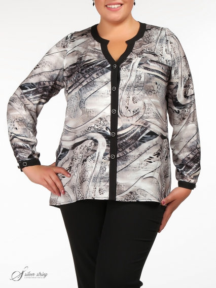 Классическая блузка прямого силуэта. Рукав длинный, втачной. Вырез горловины фигурный. По полочке расположены декоративные подрезы, которые выделены кантами из отделочной ткани.