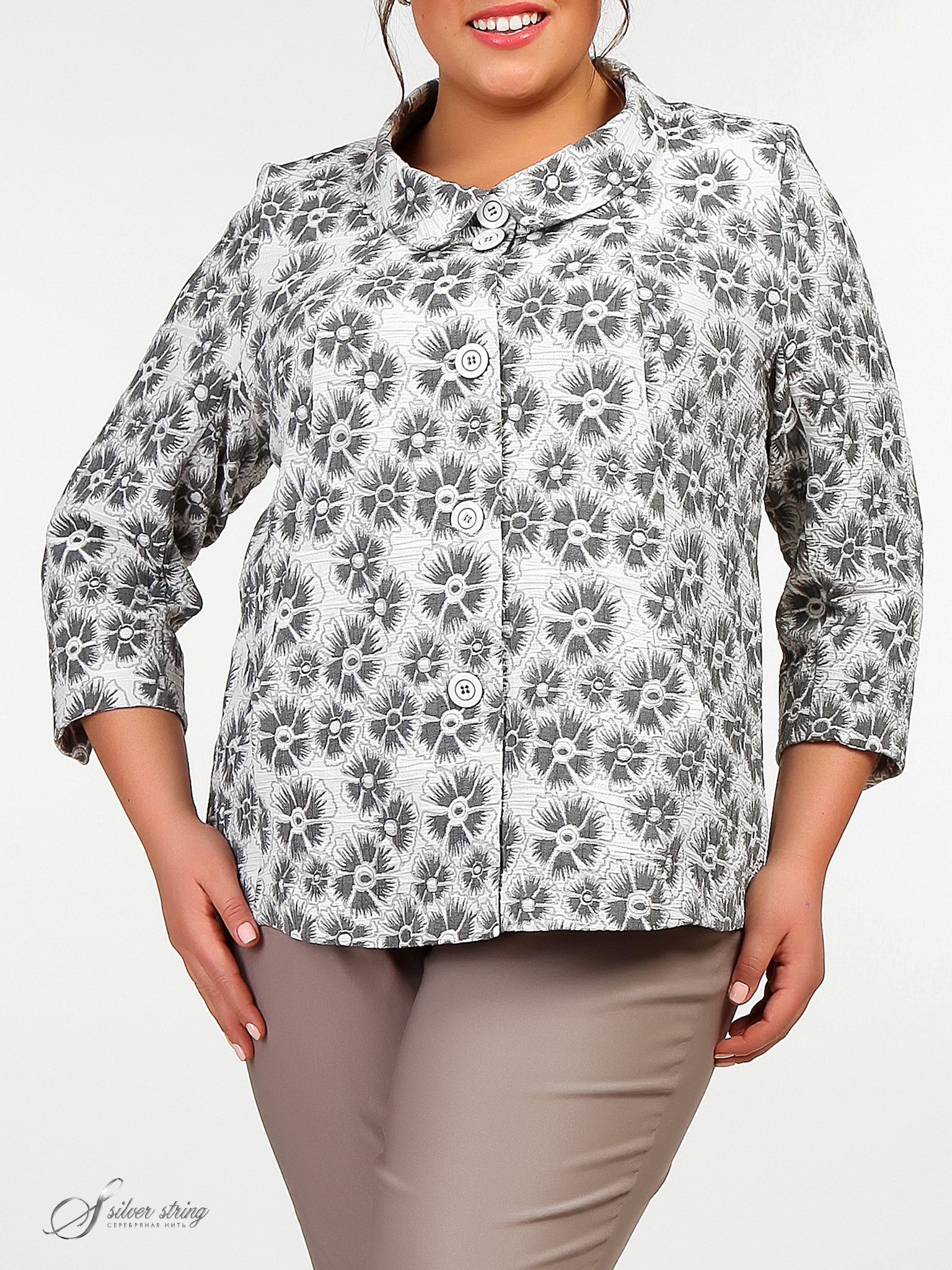 Укороченный жакет полуприлегающего силуэта с отложным воротником из ткани с жаккардовым рисунком, со значительным стрейчем. В отделке используется однотонный материал с эффектом-"крэш" . В рельефных швах обработаны карманы. Рукав длиной 3/4, с разрезом в локтевом шве. Изделие выполнено в простом элегантном стиле, где классические элементы поданы легко и непринужденно.