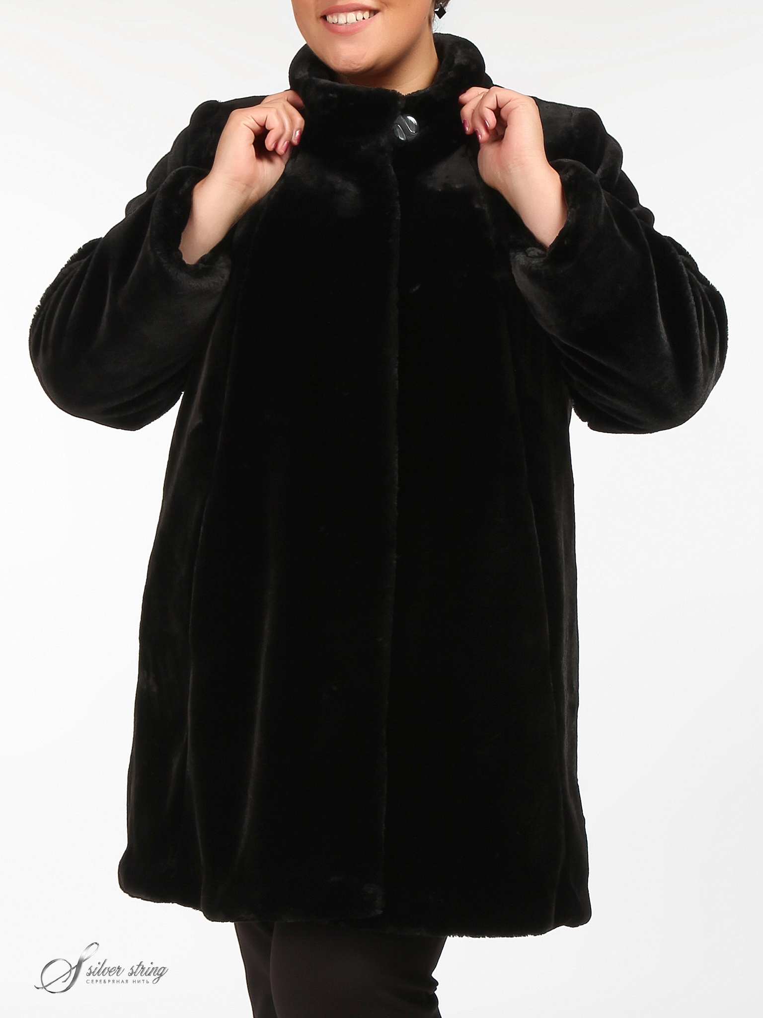 Пальто из искусственного меха, прямого силуэта. Воротник стойка на большой пуговице. Рукав втачной, длинный. Застежка супатная. Карманы в шве.