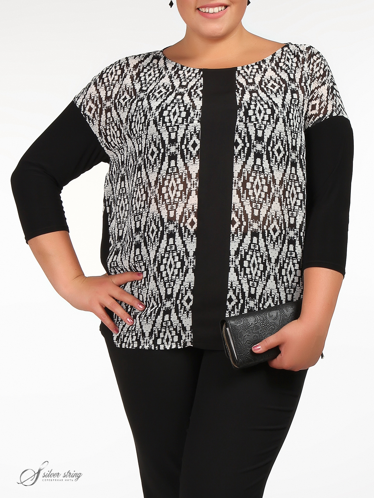 Блузка свободного кроя. Рукав спущенный. Боковые вставки и рукав из однотонного трикотажа. Форма горловины- лодочка". По полочке вертикальная вставка из отделочной ткани, которая визуально вытягивает силуэт и разбивает геометрический рисунок ткани.