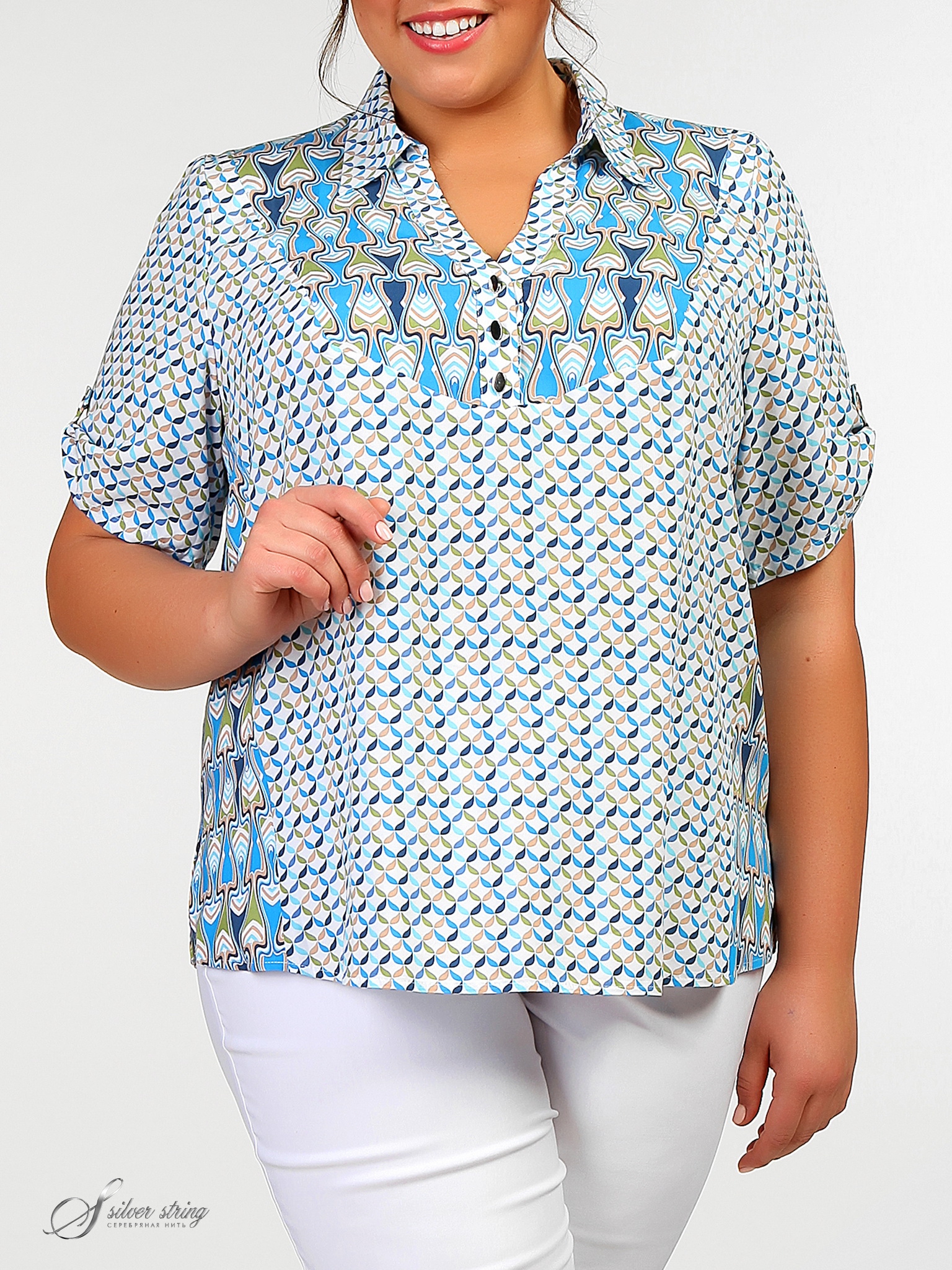 Блуза прямого силуэта из вискозного высококачественного полотна. Фигурный вырез горловины оформлен планками, переходящими в застежку-поло. Боковые вставки позволяют визуально уменьшить фигуру, на полочке обработана кокетка. Рукава короткие с патами. Образ модели построен на комбинации современных тканей-компаньонов.