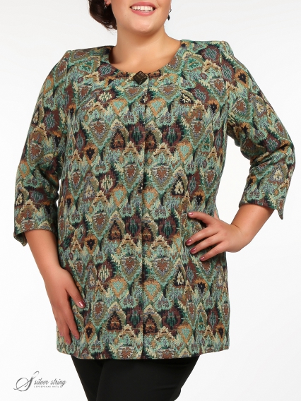 Удлиненный жакт, прямого силуэта, в классическом стиле. Горловина круглой формы. Рукав втачной, длина 3/4, с разрезом в шве. Застежка супатная. Карман прорезной с листочкой.