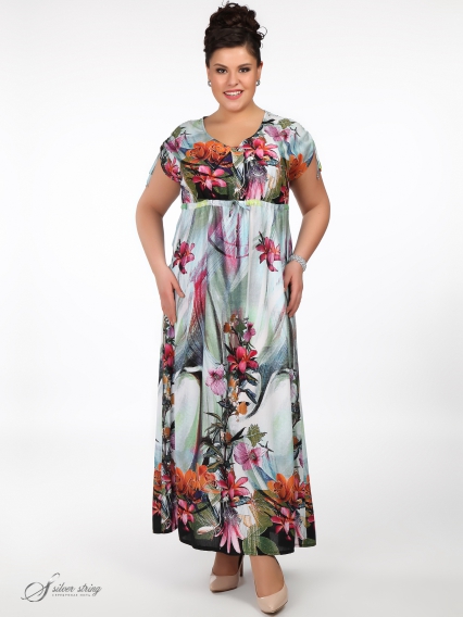 Женственное летнее длинное платье из легкой хлопковой ткани с ярким принтом, выполненным в технике "digital". Красивый вырез зоны декольте. Подрез под грудью и спущенное плечо присобраны на кулису.