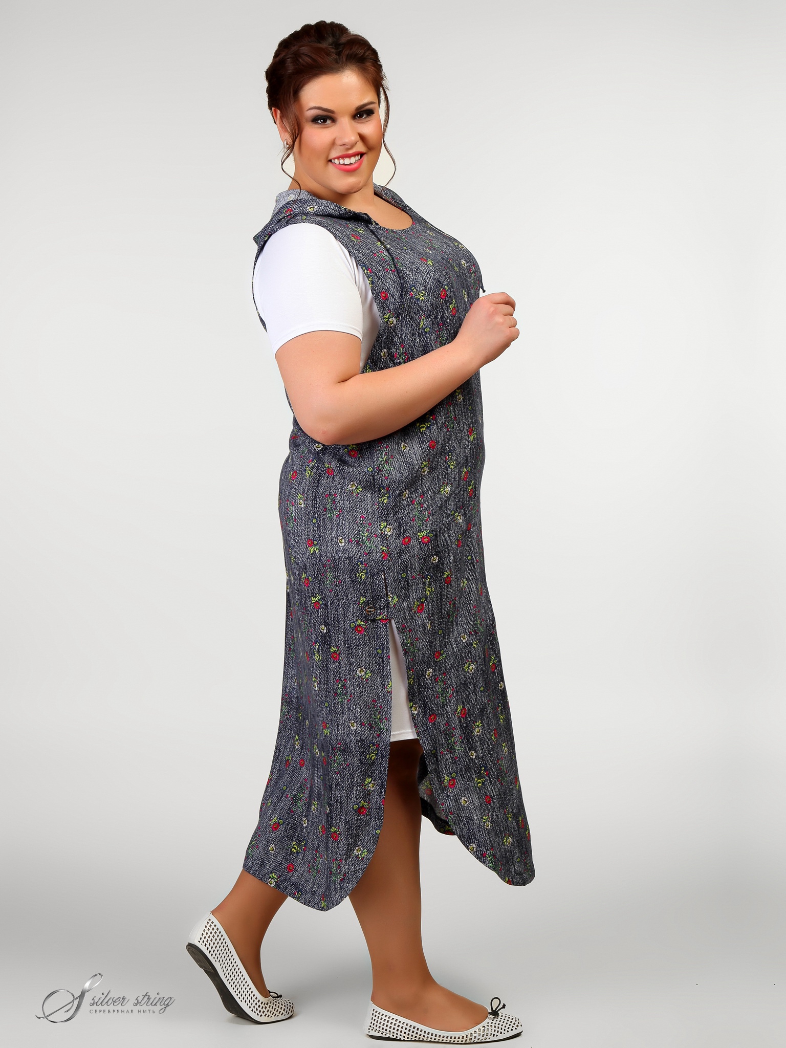 Летнее платье-обманка имитирующие сарафан, надетый поверх трикотажной блузы. Модель прямого силуэта, с капюшоном. В боковых швах обработаны высокие закругленные разрезы. На полочке расположен накладной карман. Модель отличает оригинальный дизайн и практичность натуральных материалов.