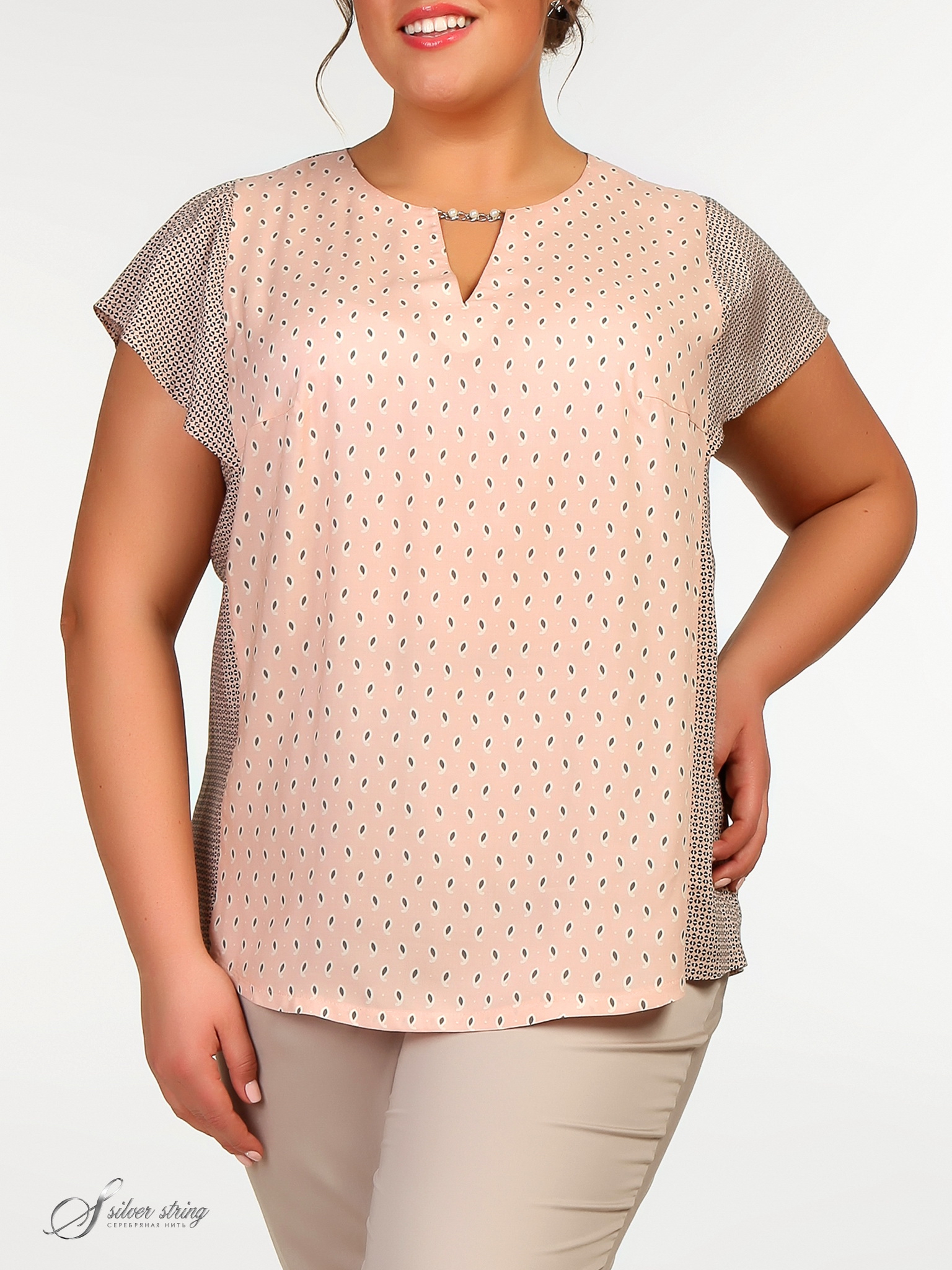 Летняя блуза из легкого штапеля. Горловина круглой формы с дополнительным вырезом треугольной формы, декорированным отделочной тканью. Рукав короткий, крылышко. Модель выполнена с учетом особенностей фигуры полных дам и позволяет подчеркнуть их достоинства и индивидуальность.