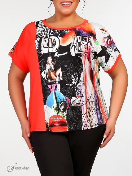Блуза полуприлегающего силуэта с цельнокройным коротким рукавом из материалов-компаньонов. Линия горловины округлой формы, расширена по плечам. В изделии использовано трикотажное полотно с оригинальным принтом, выполненным в технике digital. Горловина и низ рукава обработаны однотонными планками.