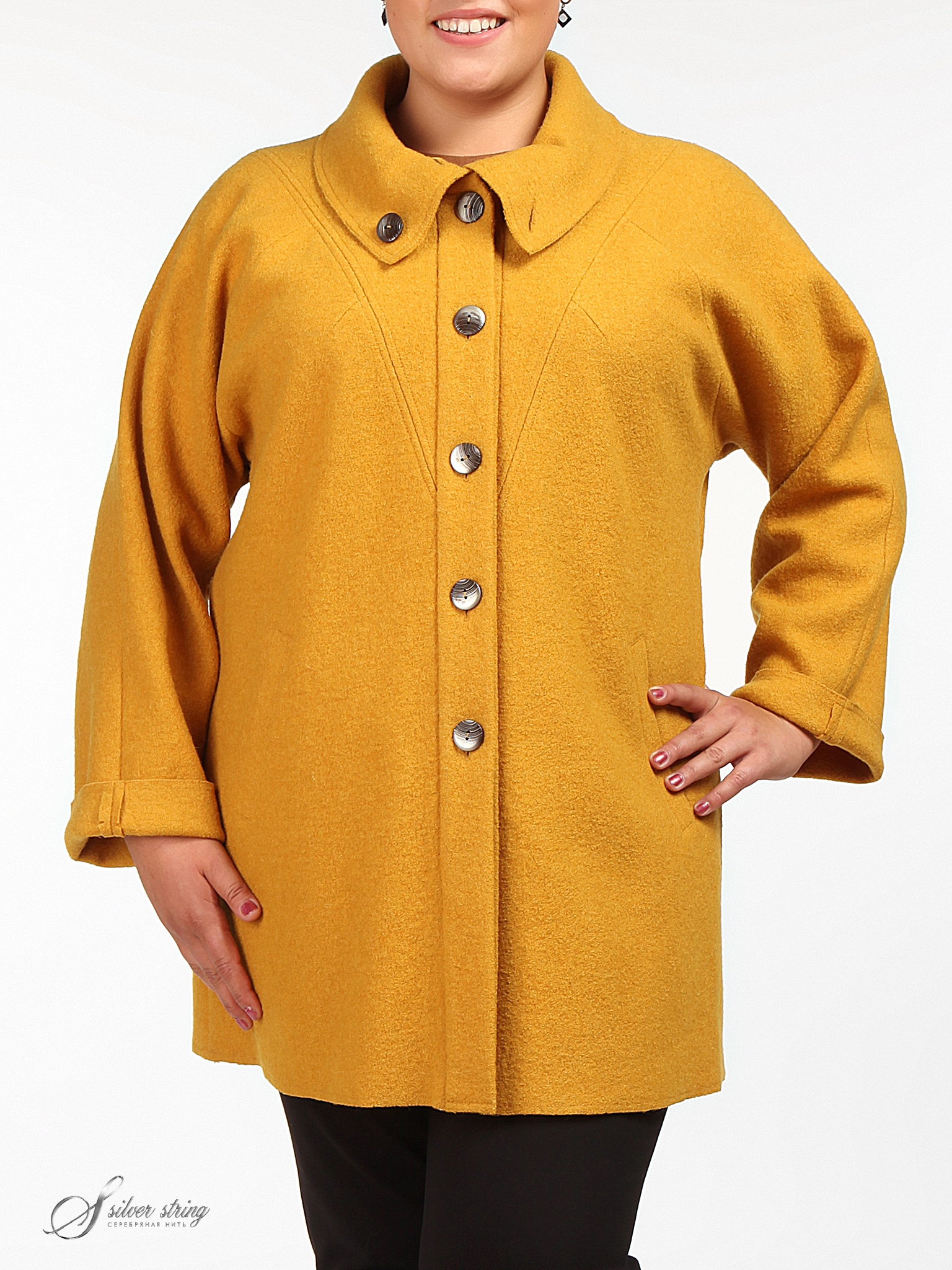 Пальто прямого силуэта. Рукав длинный, реглан. Воротник расширенный, фиксируется пуговицей. Застежка планка на петли и пуговицы. Карманы прорезные с листочкой.