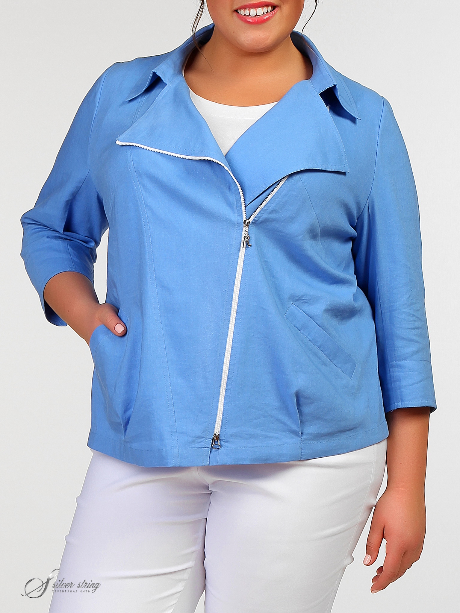 Современный укороченный жакет прямого силуэта, стилизованный по куртку-"косуху", из льняной, смесовой ткани. Рукав втачной, длиной 3/4, с разрезом в локтевом шве. На полочке обработаны прорезные карманы с листочкой. Застежка -молния по борту имеет смещённое направление. Высококачественный материал, актуальный крой - все это отвечает современным модным тенденциям.