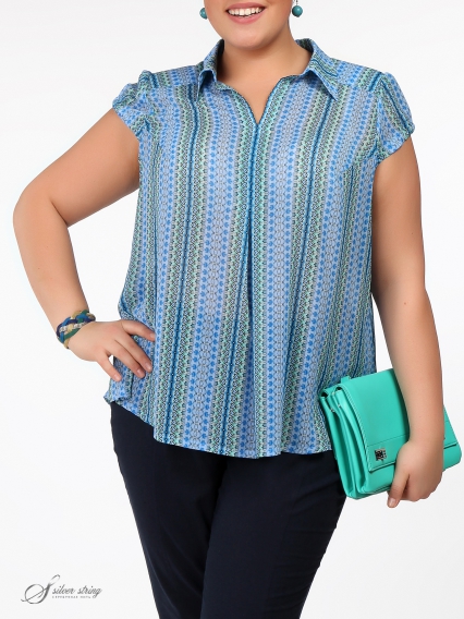 Блуза свободного силуэта, с коротким рукавом и отложным воротником на стойке. На полочке обработана мягкая складка