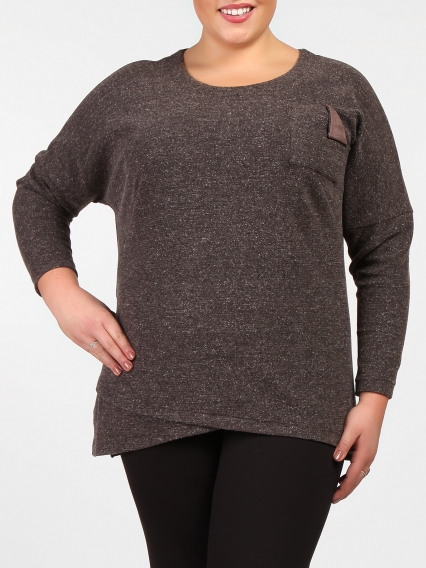 Мягкий джемпер Т-образного силуэта, с асимметричной линией низа, с разрезом по правому боку. Рукав длинный. На полочке обработан накладной карман. В отделке использована искусственная замша.