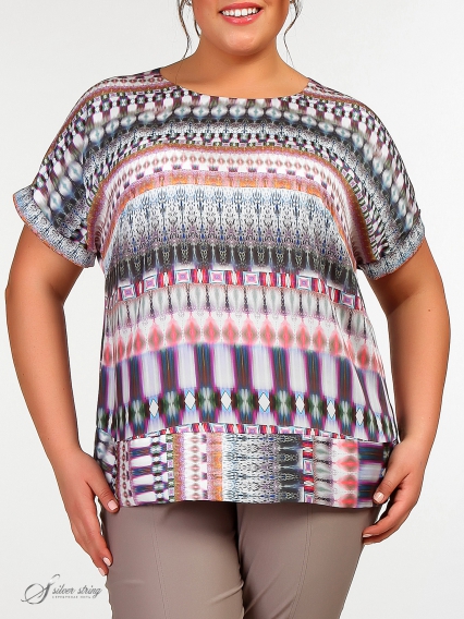 Летняя блуза прямого силуэта, с цельнокроеным рукавом. Блуза выполнена из легкой шелковистой ткани с оригинальным рисунком. Динамику модели придают кокетка полочки и отрезная деталь по низу изделия. Такая комбинация освобождает от скучных правил и позволяет свободно выражать свою индивидуальность