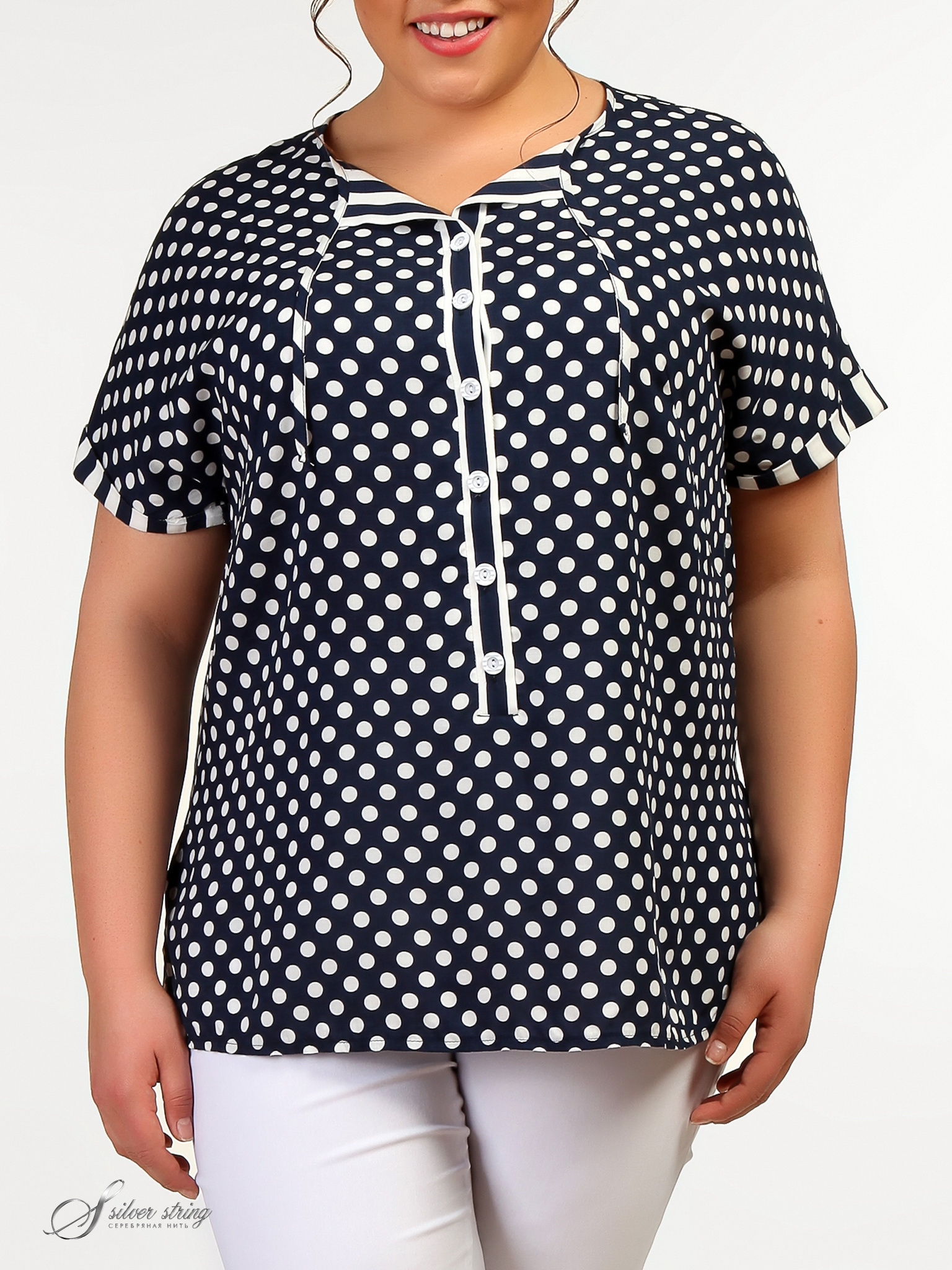 Летняя блуза прямого силуэта, слегка расширена к низу, со скругленным вырезом горловины и застежкой-поло. Рукав короткий, цельнокроеный, с отворотом из отделочной ткани. Изделие выполнено из натуральных тканей-компаньонов с классическим сочетанием рисунка: полоска и горох, с учетом особенностей фигуры полных дам и позволяет подчеркнуть их достоинства и индивидуальность.