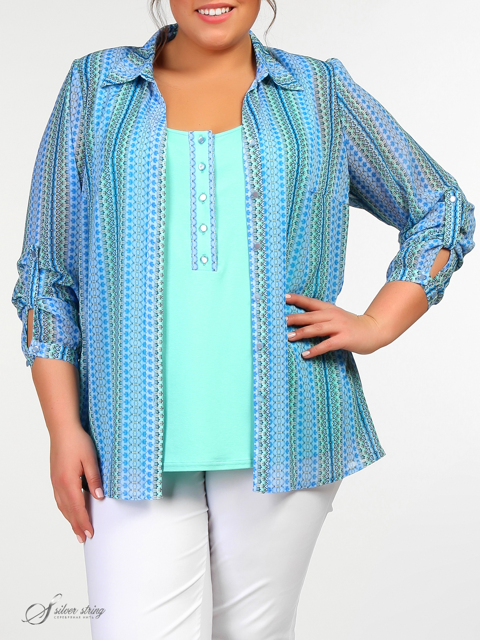 Комплект состоит из и удлиненной блузы и топа. Блуза прямого силуэта, с рубашечным воротником, выполнена из крэш-шифона. Длинный рукав с манжетой, с помощью паты, легко превратить рукав, длиной 3/4.Топ без рукавов, с круглым вырезом и застежкой поло, выполнен из эластичного трикотажного полотна. Модель отличает продуманный дизайн и практичность высококачественных материалов.