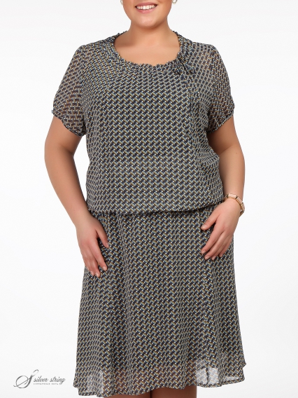 Шифоновая блуза с коротким рукавом и круглой горловиной, вдоль которой проходит кулиса-затяжка.Пояс обработан на многоигольной машине с челночной резинкой.