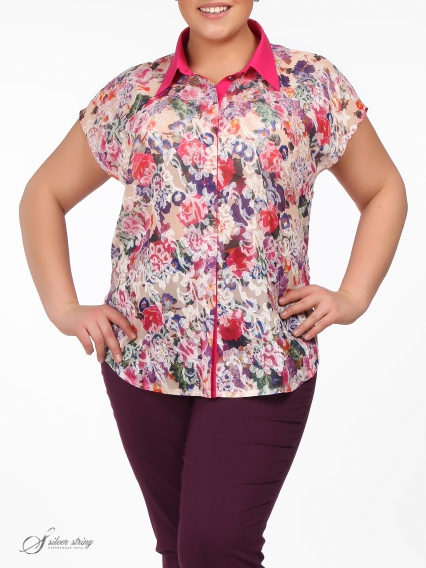 Летняя блуза полуприлегающего силуэта с коротким рукавом покроя "кимоно" и рубашечным воротником. На полочке обработана супатная застежка на пуговицы. Спинка модели выполнена из однотонной, яркой ткани, а полочка из ткани с цветочным принтом, поверх которого нанесена вышивка.