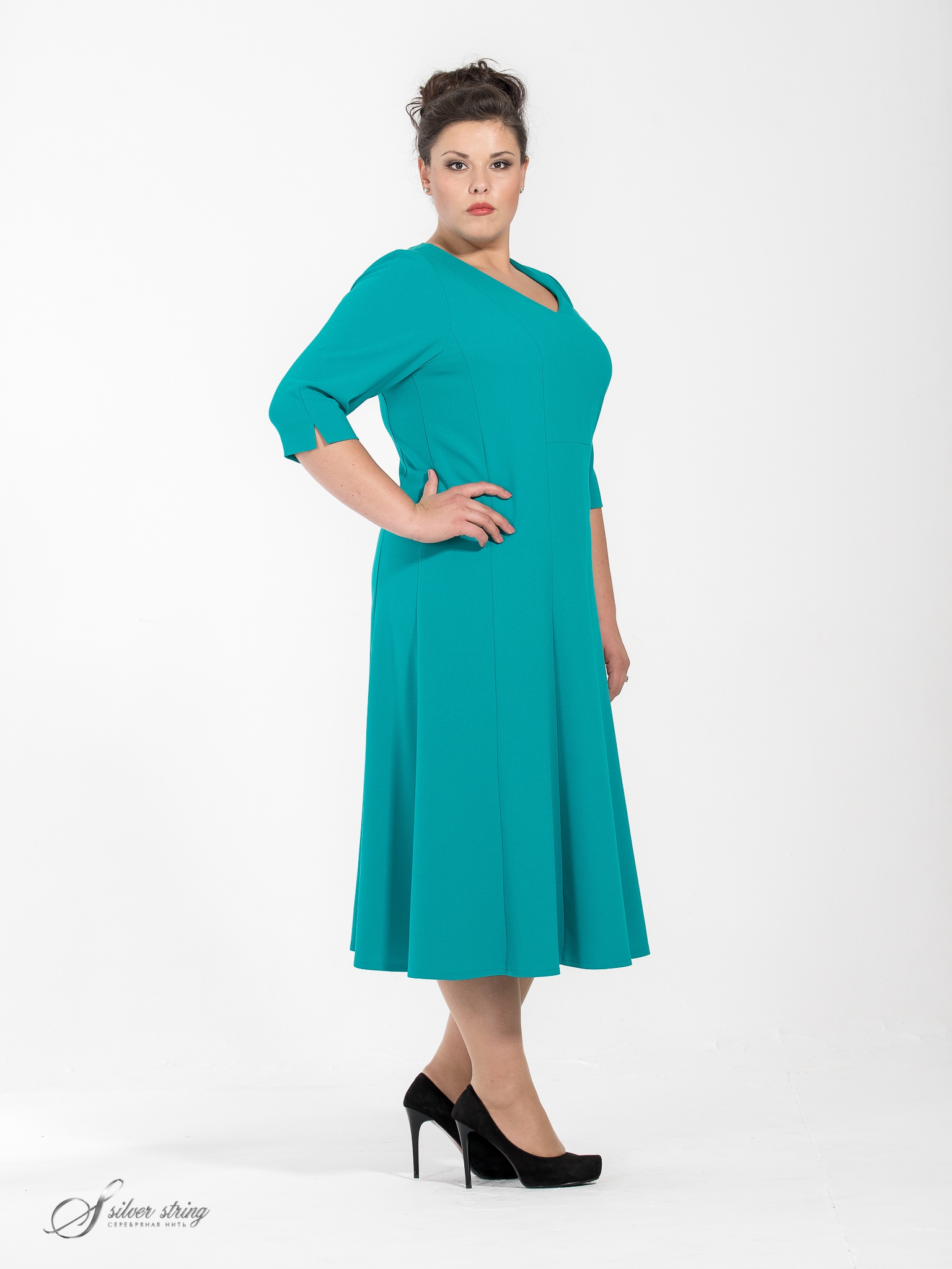 Удлиненное платье из эластичного крепа, с у-образной горловиной и рукавом, длиной 3/4. Модель с лифом небольшого объема и клешем к низу. В боковом шве обработана потайная молния.