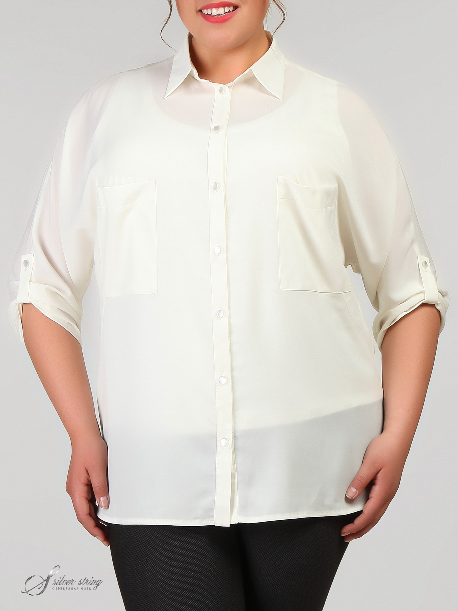 Блуза свободного силуэта с цельнокроеным рукавом и фигурно оформленной линией низа. Изделие выполнено из благородного тонкого крепа. На полочке расположены накладные карманы. Рукав подхвачен патой. Современная ткань и стильный дизайн делают модель изысканной и элегантной.
