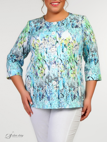 Жакет прямого силуэта с втачным рукавом длиной 3/4, с отворотом. Горловина круглой формы, по борту застежка на пуговицы. Изделие выполнено из хлопчатобумажной ткани с эластаном. В рельефах полочки расположены карманы с листочкой.