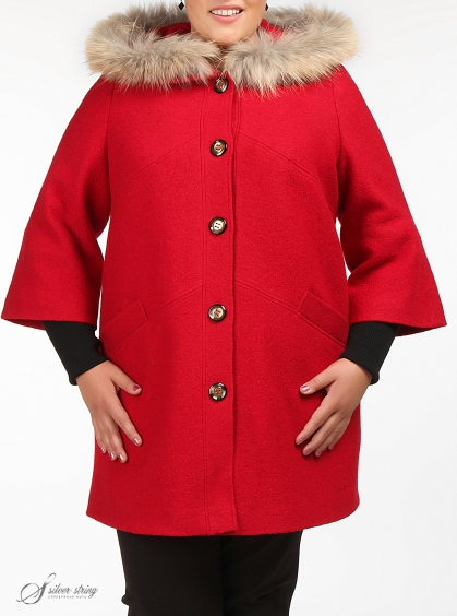 Пальто красное прямого силуэта. Рукав втачной, 3/4, расширенный к низу с трикотажным подвязом. Модель с капюшоном (мех натуральный, съемный). Застежка планка на петли и пуговицы. Карманы в швах с листочкой. Утепленное.