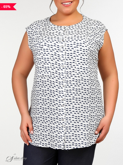 Летняя блуза прямого силуэта с круглой горловиной и удлиненной линией плеча, без рукавов. В боковых швах обработаны закругленные разрезы. На полочке расположены крупные накладные карманы. Модель выполнена из легкой хлопковой ткани с мелким анималистическим рисунком. В изделии прекрасно сочетаются непринуждённость и удобство с лаконичностью кроя.