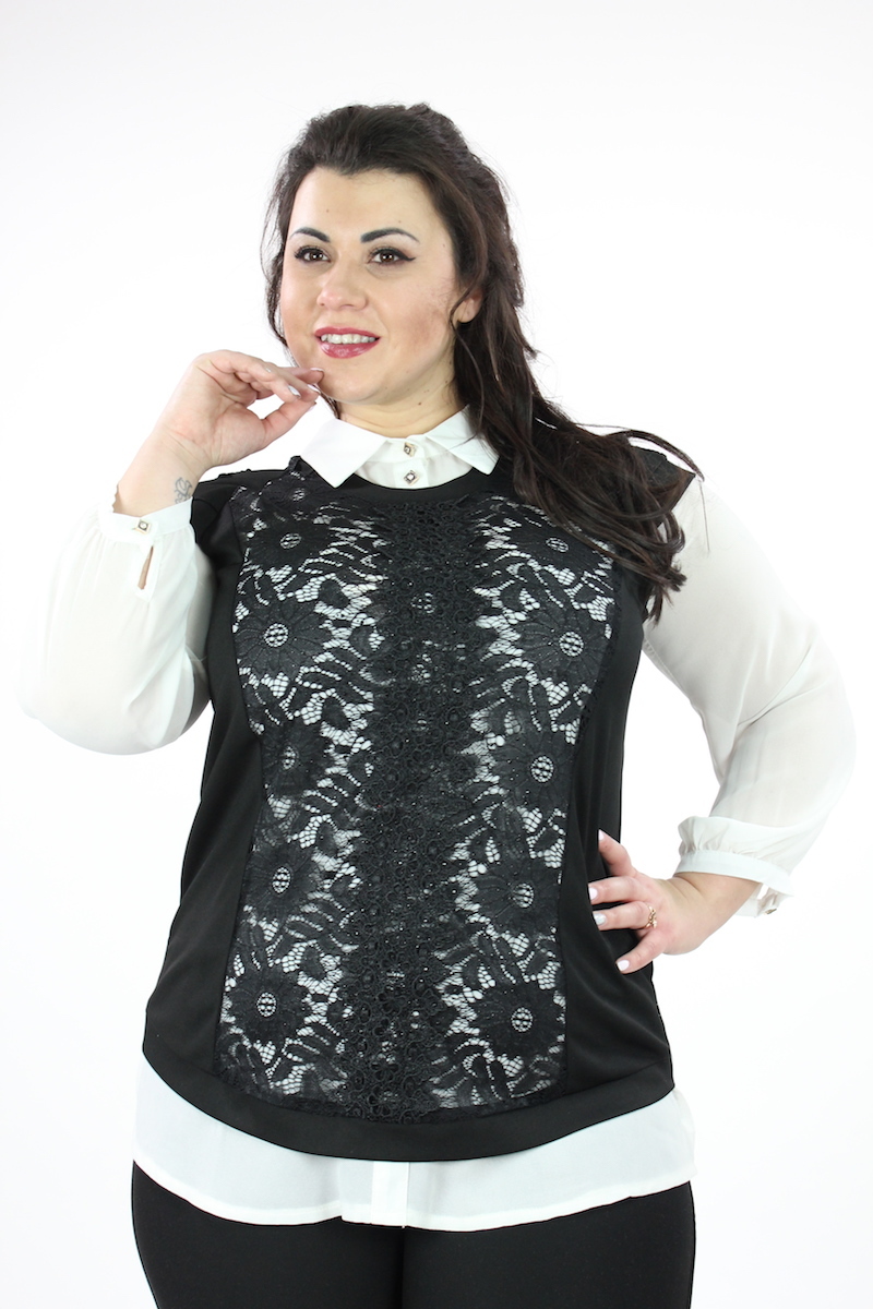на пуговицах, и надетого поверх неё ажурного джемпера