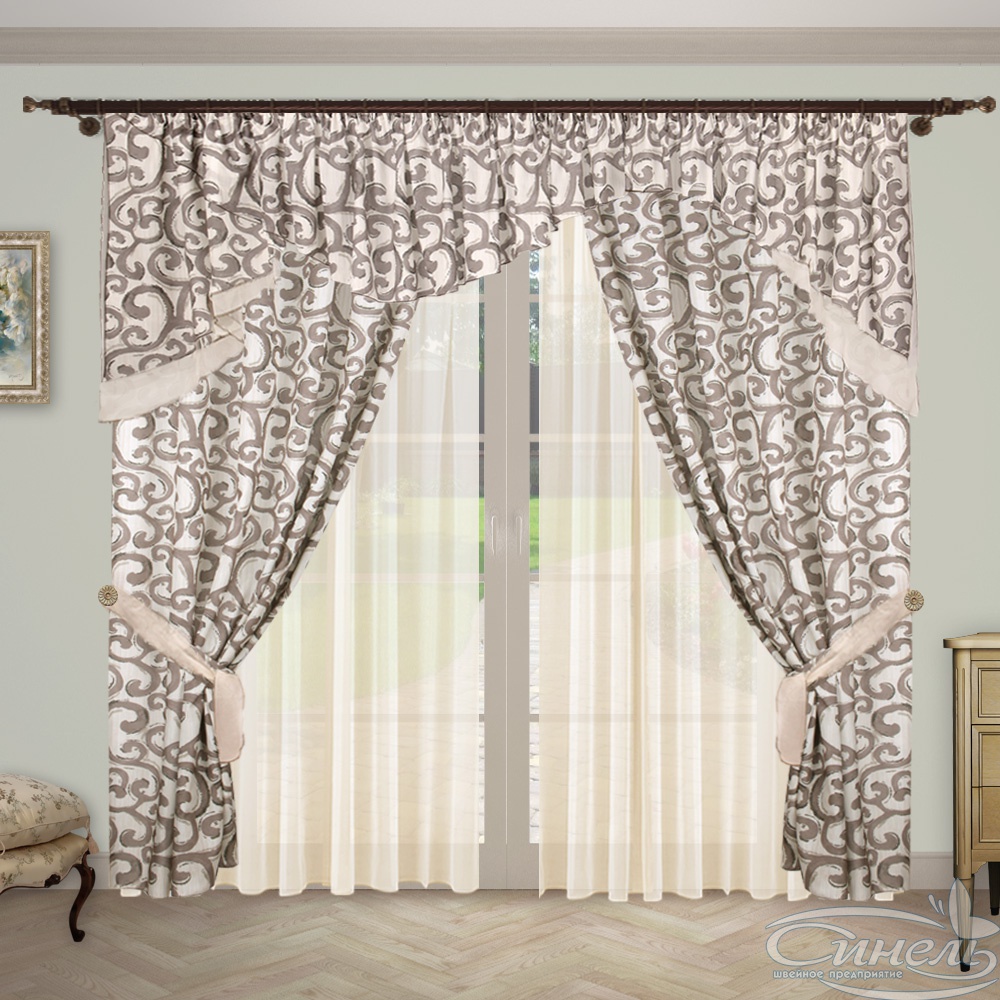 Нарядный комплект в пастельных тонах для гостиной или спальни. Асимметричный ламбрекен стягивается произвольными складками на нужный размер карниза.Сверху на все элементы пришита драпировочная лента с петлями для крючков.
