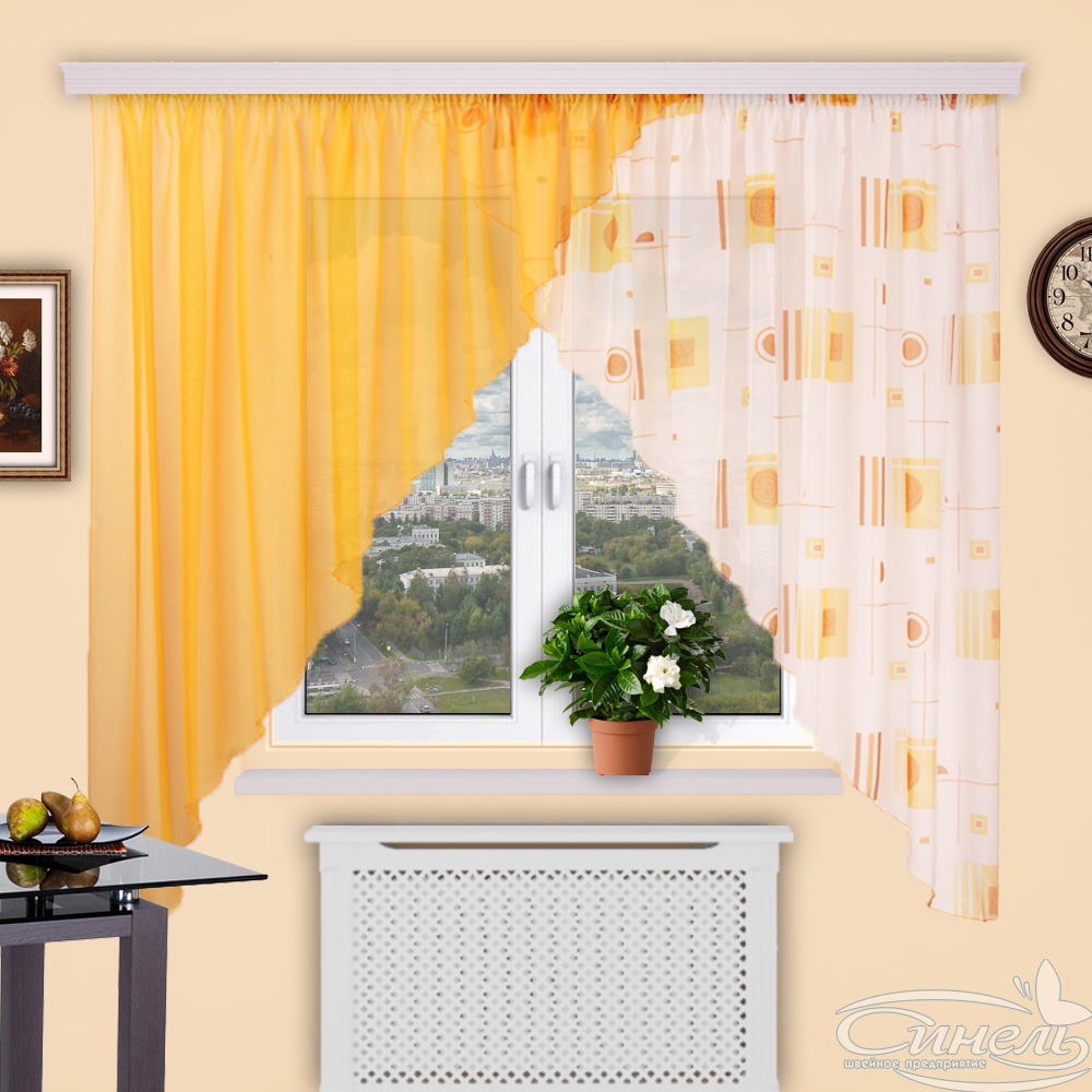 Лёгкая, открытая шторка для кухни. Ассиметрично сочетает в себе однотонную вуаль и вуаль с рисунком. Ширина 4 метра даёт хорошую драпировку на карнизе от 1,5 до 3 метров. Вывешивается на один ряд.Сверху пришита драпировочная лента с петлями для крючков.Подойдёт для любого вида карниза.