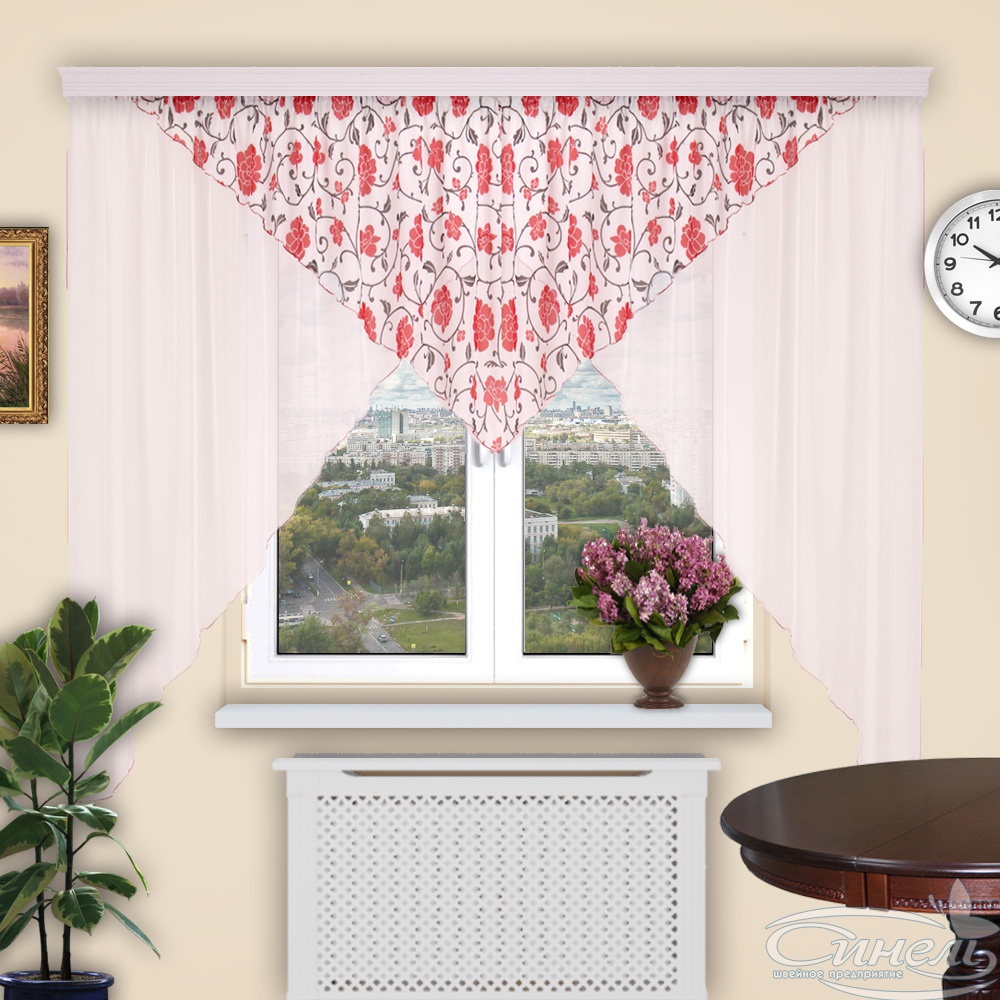 Модель нарядно обрамляет окно игривыми складками удачно сочетая однотонную лёгкую вуаль и вуаль с рисунком. Ширина 4,4 метра даёт хорошую драпировку на карнизе от 2 до 3,0 метров.