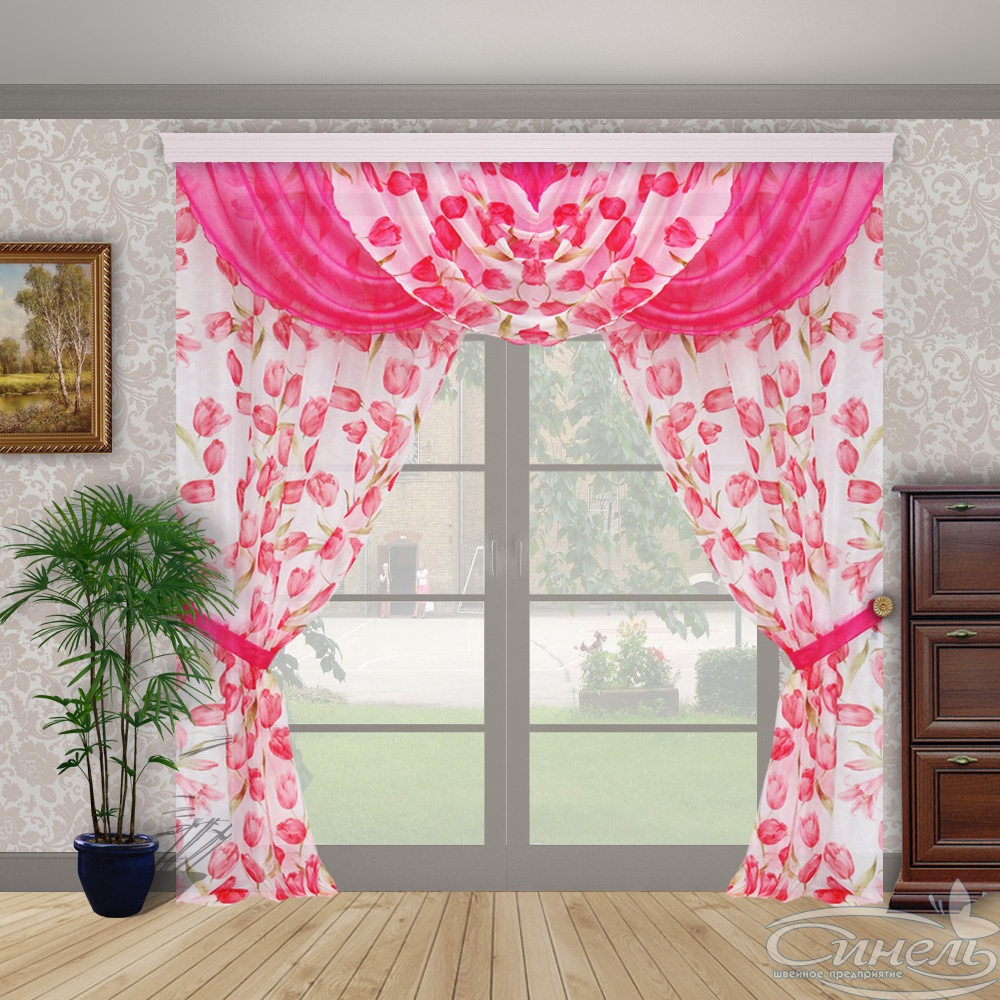 Нарядный и воздушный комплект украсит интерьер любой комнаты.Ламбрекен очень прост в эксплуатации(стягивается на драпировочной ленте). Вывешивается на один или два ряда.Сверху пришита драпировочная лента с петлями для крючков.Подойдёт для любого вида карниза от 1,5 до 3,0м .