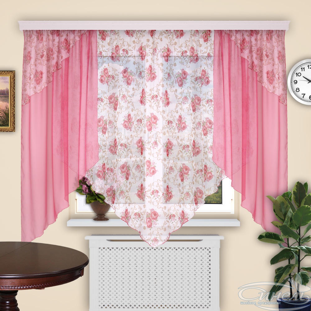 Современный комплект для кухни выполненный из воздушной вуали .Геометрические формы этой модели удачно обрамляют окно и добавляют шарма интерьеру.