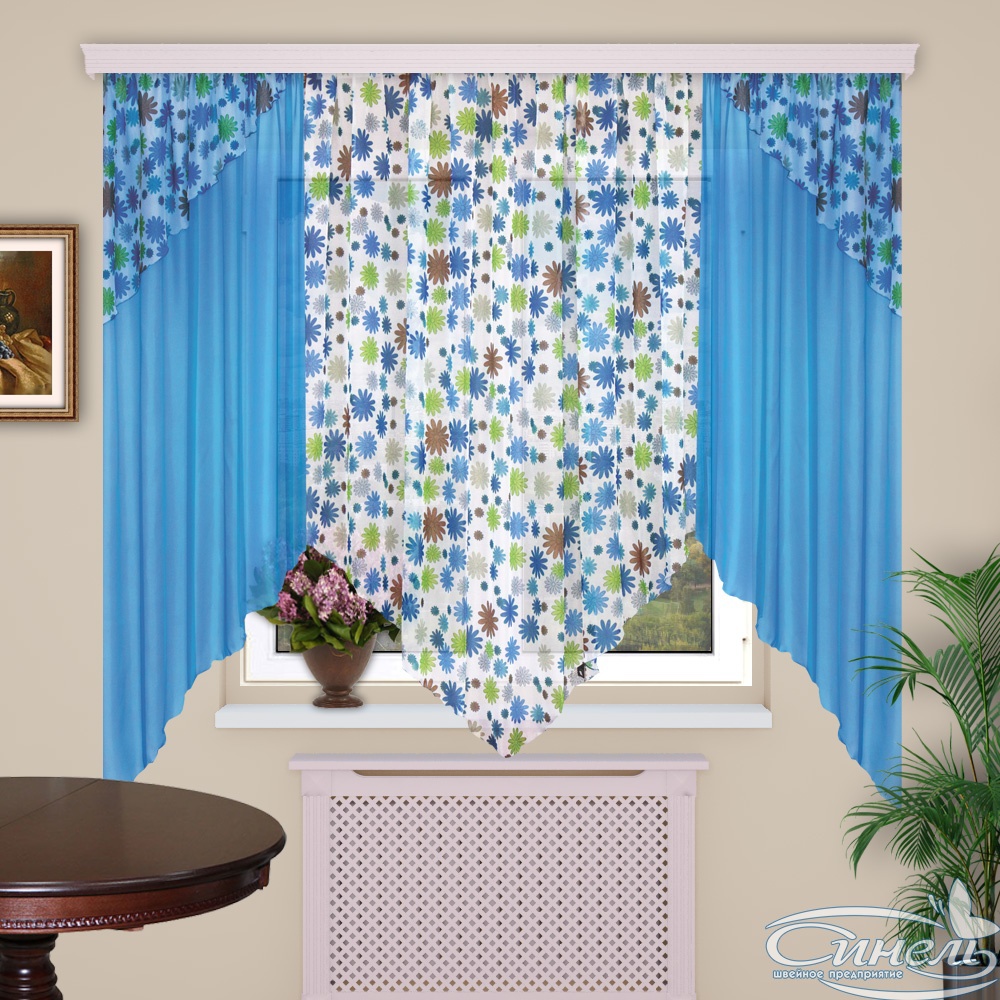Современный комплект для кухни выполненный из воздушной вуали .Геометрические формы этой модели удачно обрамляют окно и добавляют шарма интерьеру.