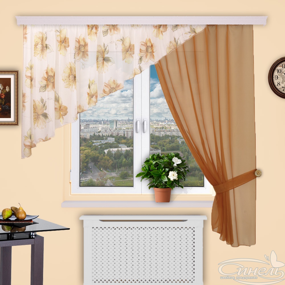 Открытая ассиметричная модель удачно сочетает однотонную ткань и ткань с рисунком. Учитывая размеры, будет удачно смотреться на карнизе от 1,5 до 2,5 метров. Вывешивается на один или два ряда.Сверху пришита драпировочная лента с петлями для крючков.Подойдёт для любого вида карниза. Есть на левую и на правую сторону. При заказе данной модели, обязательно уточняйте в комментарии к заказу, с какой стороны длинная часть шторы.
