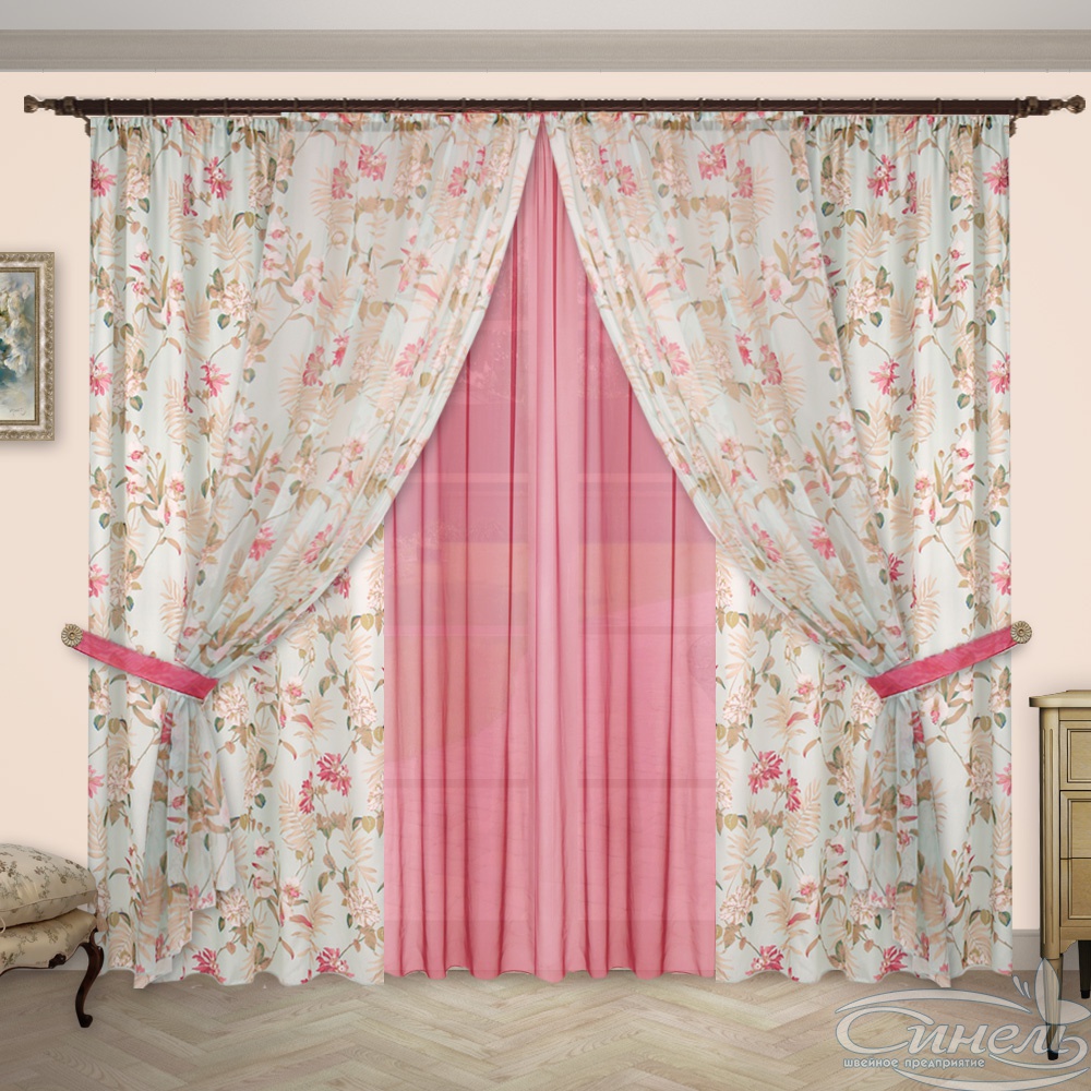 Роскошный комплект из тканей-компаньонов имеет множество вариантов вывешивания. Различные варианты оформления окна можно посмотреть на маленьких фото под основным.В комплекте 2 шторы из принтованной вуали и 4 шторы из однотонной вуали и два подхвата.
