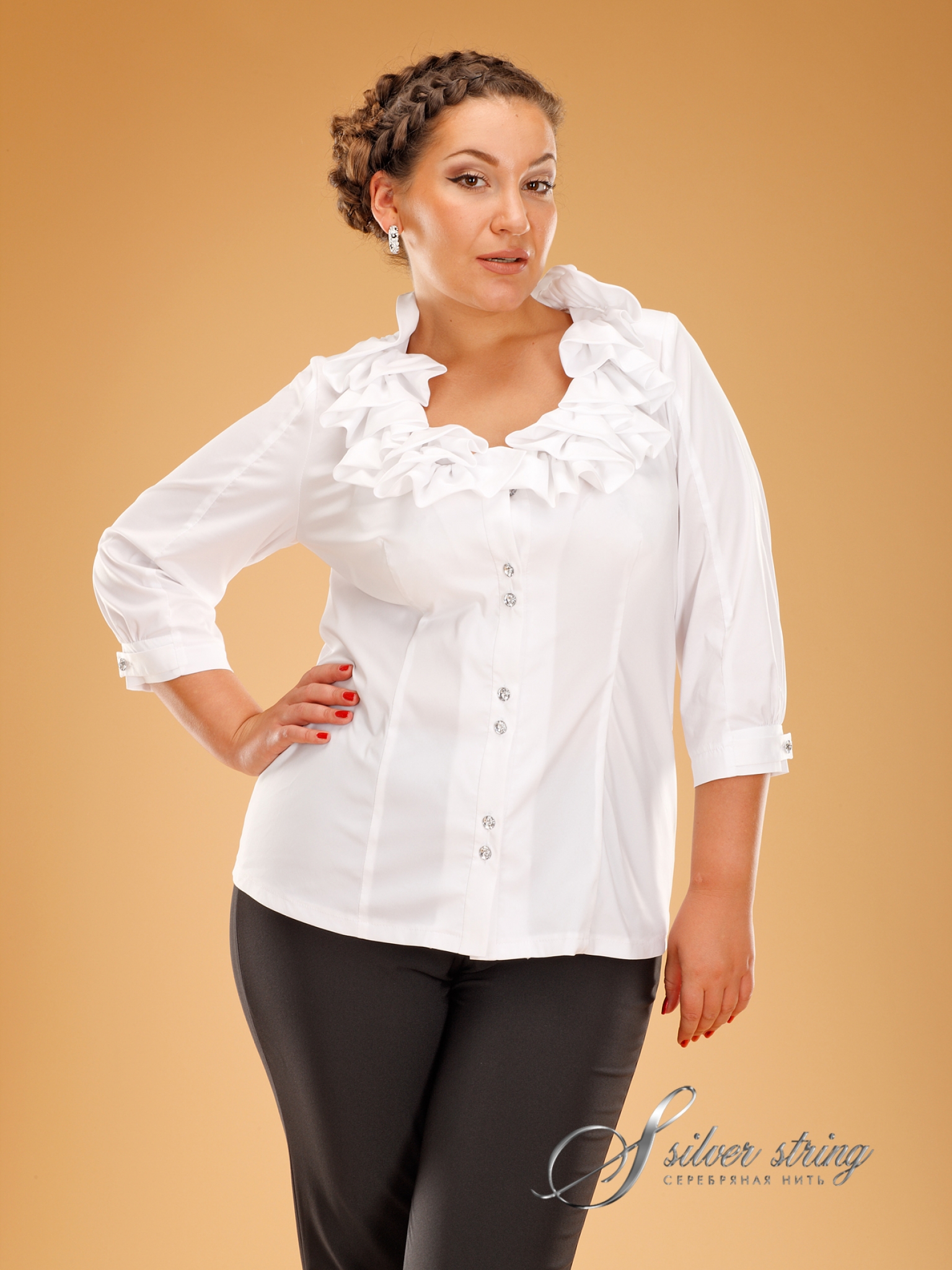 Нарядная блуза полуприлегающего силуэта из эластичной ткани. Рукав длиной 3/4 имеет регулировку объема по низу. Выразительность модели придает оригинальная отделка по линии декольте.