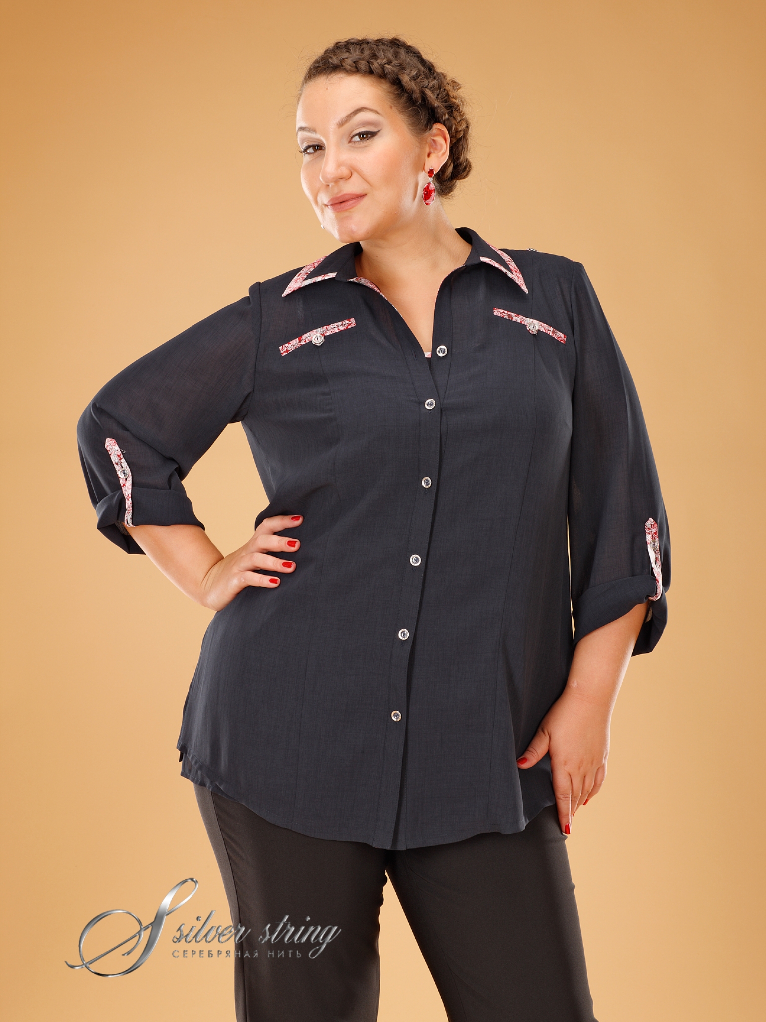 Комплект состоит из удлиненного блузона и топа. Изделие выполнено из разнофактурных тканей. Контрастной отделкой подчеркнуты рамки ложных карманов, воротник, планки борта и стойка. Рукав имеет навесную декоративную петлю для крепления отворота. Горловина топа также выделена отделочной тканью.