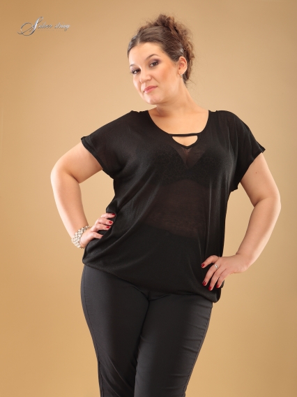 Легкая блуза выполнена из трикотажного полотна с большим содержанием вискозы. Контрастная отделка подчеркивает оригинально оформленный У-образный вырез.