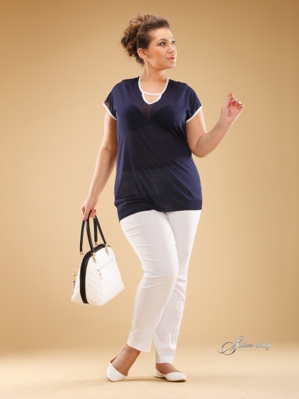 Легкая блуза выполнена из трикотажного полотна с большим содержанием вискозы. Контрастная отделка подчеркивает оригинально оформленный У-образный вырез.